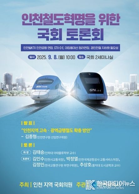 [ 한국미디어뉴스 이원영 기자 ] 인천광역시는 지역 국회의원들과 함께 9월 8일 국회의원회관 제2세미나실에서 ‘인천 철도 혁명을 위한 국회 토론회’를 개최했다고 밝혔다.