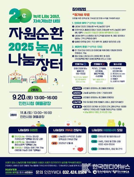 [ 한국미디어뉴스 이원영 기자 ] 인천광역시는 시민들의 탄소중립 실천과 나눔 문화 확산을 위해 인천시가 주최하고 인천YWCA가 주관하는 ‘2025 자원순환 녹색 나눔장터’를 오는 9월 20일 애뜰광장에서 개최한다고 밝혔다.