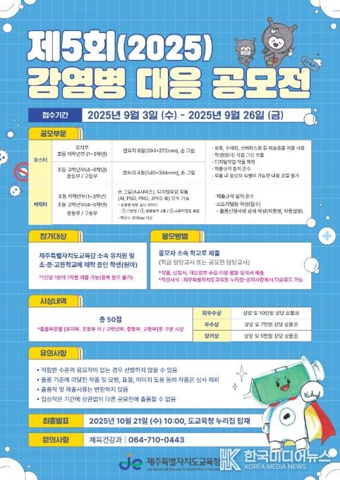 [ 한국미디어뉴스 이원영 기자 ] 제주특별자치도교육청은 오는 26일까지 학생들이 안전하고 건강한 학교와 사회를 만들 방법을 스스로 생각하고 실천할 수 있는 기회를 제공하기 위해 ‘제5회 감염병 대응 공모전’을 개최한다.