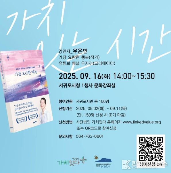 참여인원은 서귀포시민(공무원 포함) 150명이며, 신청기간은 9월 11일까지로 150명 신청 시 조기 마감된다. 신청방법은 사단법인 가치잇다 홈페이지를 활용하면 되고 신청문의는 사단법인 가치잇다 사무국으로 하면 된다.