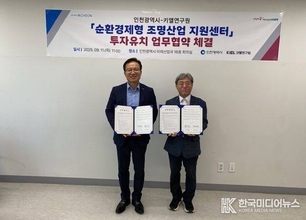 [ 한국미디어뉴스 이원영 기자 ] 인천광역시는 9월 11일 조명기술 분야 국내 최고 전문기관인 키엘연구원과 ‘순환경제형 조명산업 지원센터’ 설립을 위한 투자유치 협약을 체결했다고 밝혔다.