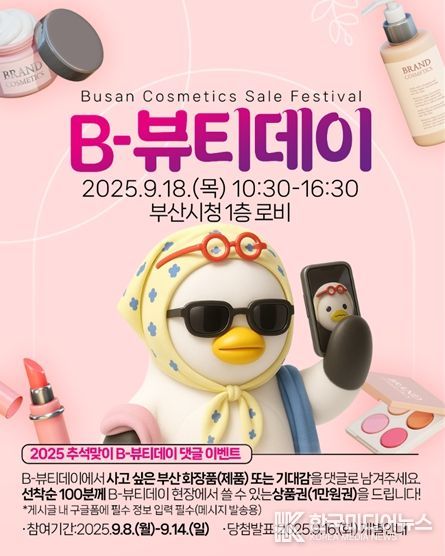 [ 한국미디어뉴스 이원영 기자 ] 부산시는 오는 9월 18일 오전 10시 30분부터 오후 4시 30분까지 시청 1층 로비에서 '2025 추석맞이 비(B)-뷰티 데이'를 개최한다고 밝혔다.