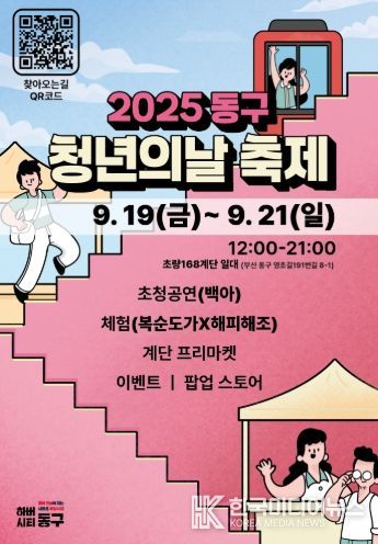 [ 한국미디어뉴스 이원영 기자 ] 부산광역시 동구는 청년들의 창의와 열정을 응원하고 지역사회와의 소통을 강화하기 위해 오는 9월 19일부터 21일까지 2025년 ‘동구 청년의 날 축제’를 개최한다고 밝혔다.