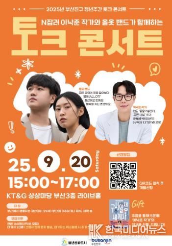 [ 한국미디어뉴스 이원영 기자 ] 부산진구는 오는 9월 20일 오후 3시, KT&G 상상마당 부산 3층 라이브홀에서 청년들을 위한 특별한 소통의 장, ‘2025 청년주간 토크콘서트’를 개최한다고 밝혔다.