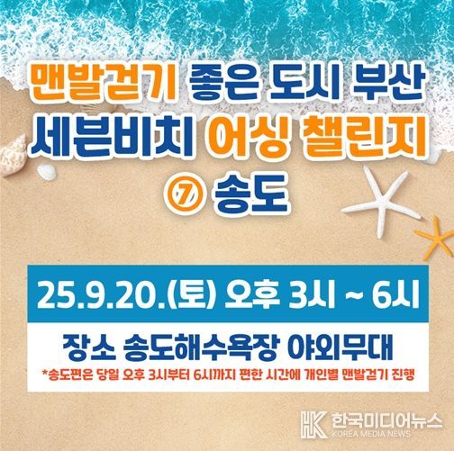 [ 한국미디어뉴스 이원영 기자 ] 부산시는 오는 20일 토요일 오후 3시 송도해수욕장 일원에서 '맨발걷기 좋은 도시 부산, 세븐비치 어싱챌린지'의 마지막 일곱 번째 편을 개최한다고 밝혔다.