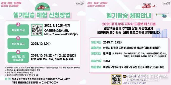 신청을 희망하는 시민은 양주시 공식 홈페이지 또는 SNS채널을 검색하여 접속한 뒤, ‘2025 드론봇 페스티벌 헬기탑승체험’ 안내 게시물을 참고하여 온라인으로 신청할 수 있다.