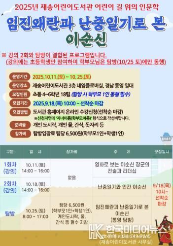 [ 한국미디어뉴스 이원영 기자 ] 해운대구는 ‘여행하는 어린이 길 위의 인문학’프로그램 ‘임진왜란과 난중일기로 본 이순신’참가자를 모집한다.