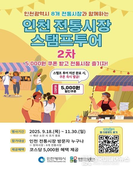 [ 한국미디어뉴스 이원영 기자 ] 인천광역시와 인천관광공사는 전통시장의 매력을 널리 알리고 지역 경제 활성화를 도모하기 위해 ‘매력으뜸 전통시장 육성사업’의 일환으로 오는 9월 18일부터 11월 30일까지 ‘2025년 제2차 인천 전통시장 모바일 스탬프투어’를 개최한다고 밝혔다.