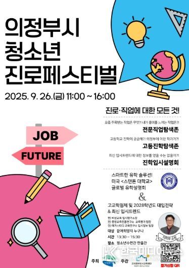 [ 한국미디어뉴스 김서안 기자 ] 의정부도시교육재단은 청소년 진로탐색을 지원하고 미래역량 강화를 돕기 위해 2025년 9월 26일 의정부시청소년수련관에서 '2025년 의정부시청소년진로페스티벌'을 개최한다.