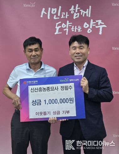 [ 한국미디어뉴스 김서안 기자 ] 양주시 남면 신산흥농 종묘사가 지난 17일 남면 행정복지센터를 방문해 이웃돕기 성금 100만원을 전달했다.