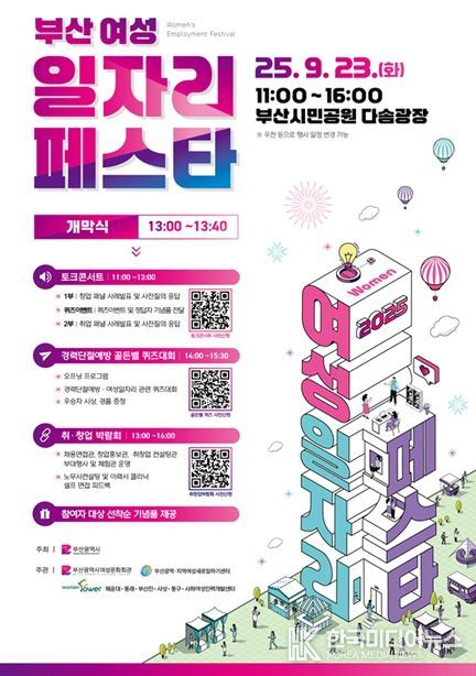[ 한국미디어뉴스 이원영 기자 ] 부산시는 오는 9월 23일 오전 11시부터 오후 4시까지 부산시민공원 다솜마당에서 '2025 부산 여성 일자리 페스타'를 개최한다고 밝혔다.