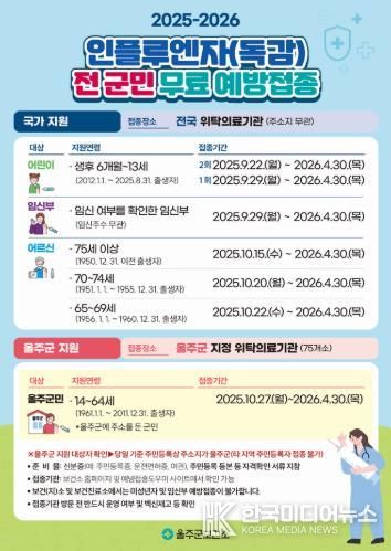 [ 한국미디어뉴스 이보영 기자 ] 울산 울주군이 오는 22일부터 내년 4월 30일까지 인플루엔자 무료 예방접종을 실시한다고 19일 밝혔다.