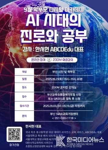 [ 한국미디어뉴스 이원영 기자 ] 부산광역시교육청교육연구정보원 SW‧AI교육거점센터는 오는 23일 오후 6시 온라인 원격 연수를 통해 관내 학부모를 대상으로 ‘9월 학부모 디지털 아카데미’를 실시한다.