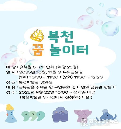 [ 한국미디어뉴스 이원영 기자 ] 복천박물관은 유치원·어린이집 등 6~7세 유아 단체 대상 교육프로그램 '복천 꿈 놀이터'를 오는 10월부터 새롭게 선보인다고 밝혔다.