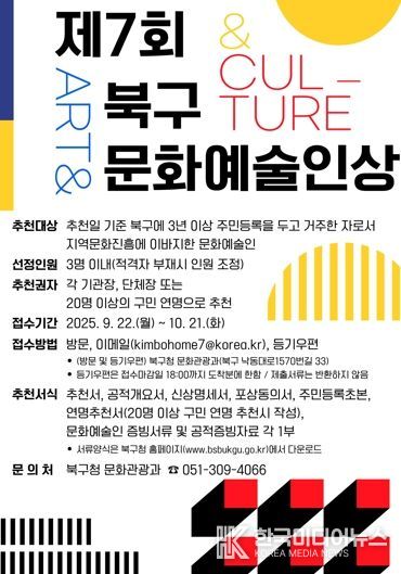 후보자 추천서류 접수 기한은 10월 21일까지다. 접수는 북구청 문화관광과(북구 낙동대로1570번길 33)에 방문하거나 등기우편, 이메일로 할 수 있다.