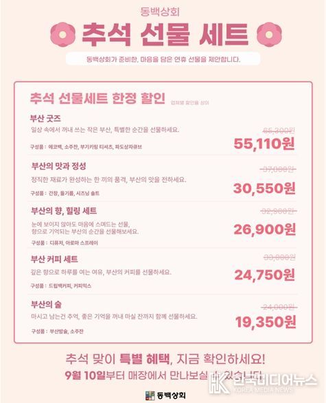 [ 한국미디어뉴스 이원영 기자 ] 부산시는 부산 우수 제품 쇼핑 숍 '동백상회'에서 추석 명절을 앞두고 지역기업 제품으로 구성된 '선물 세트'를 출시해 오는 9월 30일까지 특별 할인 행사를 한다고 밝혔다.