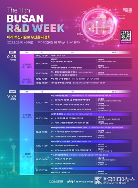 [ 한국미디어뉴스 이원영 기자 ] 부산시는 오는 9월 25일부터 26일까지 이틀간 벡스코 제2전시장에서 '제11회 부산 연구개발(R·D) 주간' 행사를 개최한다고 밝혔다.