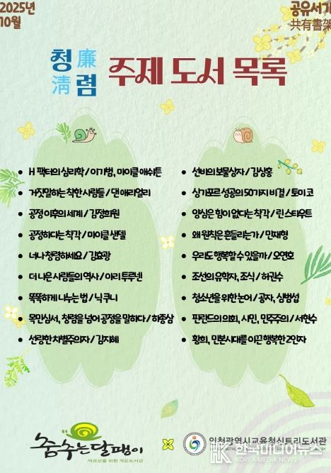[ 한국미디어뉴스 이원영 기자 ] 인천광역시교육청 신트리도서관은 10월 1일부터 31일까지 부평구 작은도서관 ‘춤추는달팽이도서관’과 함께 청렴을 주제로 공유서가를 운영한다.