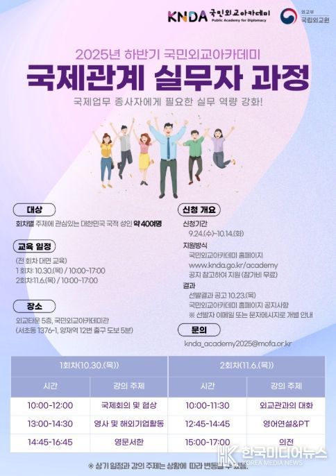 [ 한국미디어뉴스 이원영 기자 ] 외교부 국립외교원은 2025년 하반기 국민외교아카데미 국제관계 실무자 과정 참가자를 9월 24일부터 10월 14일까지 모집한다.