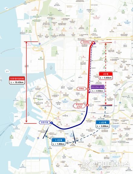 [ 한국미디어뉴스 이원영 기자 ] 인천광역시는 인천대로 일반화 도로개량공사를 1-1단계인 인천기점~독배로, 1-2단계 독배로~주안산단고가교, 그리고 2단계인 주안산단고가교~서인천IC로 세분화했으며, 오는 10월 2단계 구간을 착공해 전체 사업을 본격적으로 추진한다고 밝혔다.