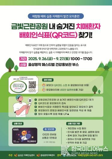 [ 한국미디어뉴스 김풍옥 기자 ] 음성군 치매안심센터는 이달 26일부터 27일까지 금왕읍 금빛근린공원 일원에서 치매환자 실종 예방과 치매 인식 개선을 위한 ‘숨겨진 배회인식표(QR코드) 찾기’ 체험행사를 개최한다고 밝혔다.