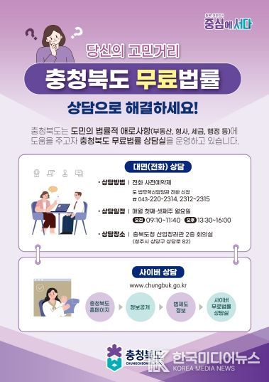 한편, 충북도는 『대면‧전화 무료법률상담실』을 통하여 올해 현재까지 162건의 상담을 실시하며 도민들의 많은 호응을 얻었다. 매월 첫째·셋째주 월요일 충북도청 산업장려관 2층 회의실에서 진행되는 대면·전화 무료법률상담을 받기 위해서는 도 법무혁신담당관(☏ 043-220-2314, 2312~2315)을 통하여 사전예약을 하면 된다.