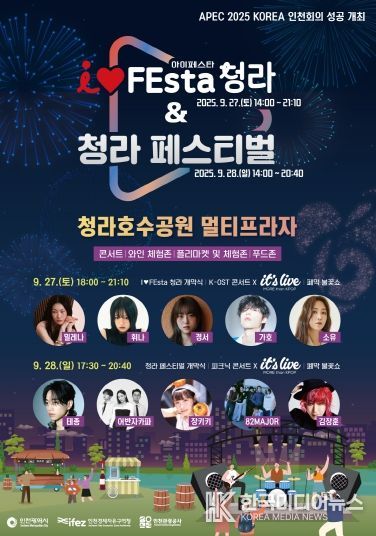 [ 한국미디어뉴스 이원영 기자 ] 인천경제자유구역청이 주최하고 인천관광공사(사장 백현)가 주관하는‘2025 I♥FEsta 청라 & 청라 페스티벌’이 9월 27일과 27일 이틀간 청라 호수공원 멀티프라자에서 열린다.