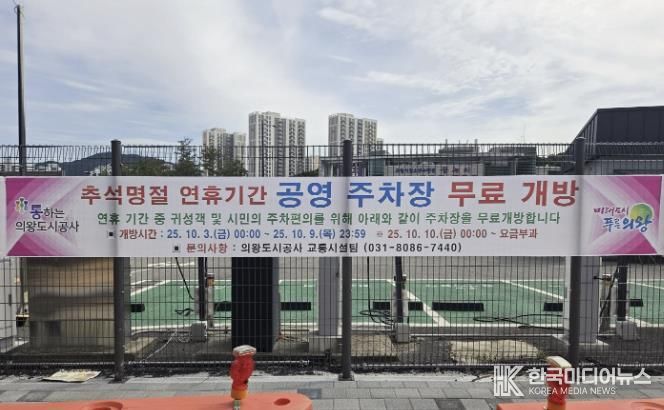 [ 한국미디어뉴스 이보영 기자 ] 의왕도시공사는 시로부터 위수탁 받아 운영 중인 관내 공영주차장을 추석 명절 연휴 기간인 10월 3일(금) ~ 10월 9일(목)까지 7일간 무료 개방한다고 밝혔다.