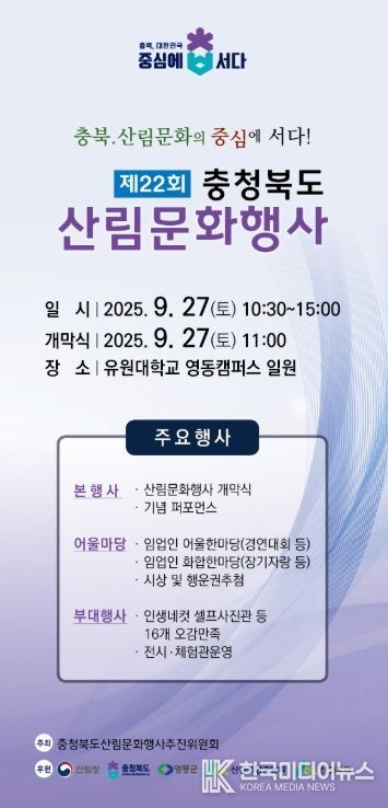 [ 한국미디어뉴스 김풍옥 기자 ] 제22회 충청북도 산림문화행사가 오는 27일 오전 10시 30분부터 영동군 유원대학교 영동캠퍼스 일원(영동읍 대학로 310)에서 열린다.