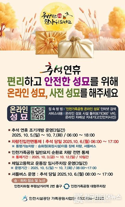 또한, 명절 연휴(10.5.~10.7.) 3일간 봉안당을 2시간 조기 개방(오전 6시~오후 6시)하고, 제일고등학교 운동장을 오전 8시부터 오후 5시까지 임시주차장으로 운영해 주차 및 교통 혼잡을 최소화할 방침이다.