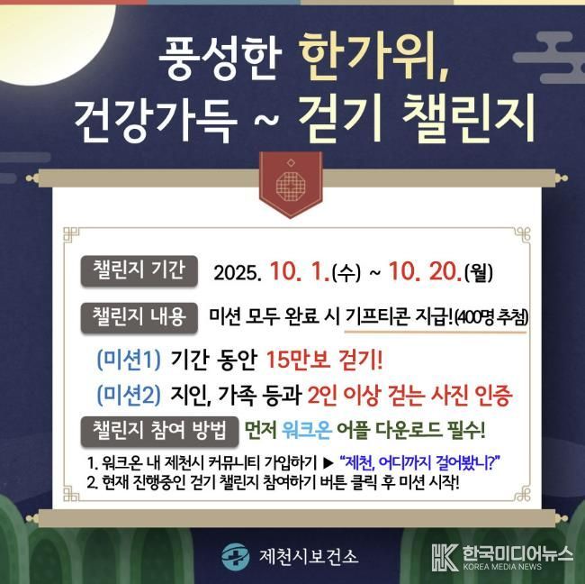 [ 한국미디어뉴스 김풍옥 기자 ] 제천시보건소는 추석 연휴를 맞아 시민의 걷기 실천을 돕기 위해 ‘풍성한 한가위, 건강가득 걷기 챌린지’를 운영한다.