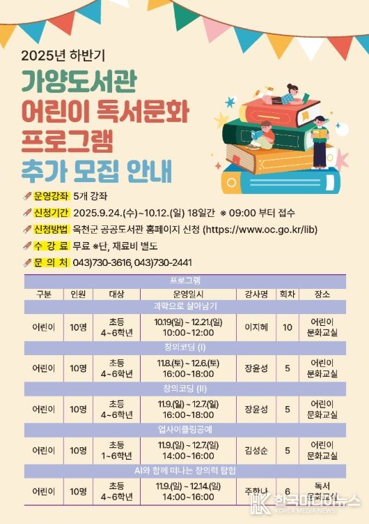 [ 한국미디어뉴스 김풍옥 기자 ] 옥천 가양도서관은 군민의 독서문화활동을 지원하기 위해 하반기 어린이 독서문화프로그램 수강생을 추가 모집한다.
