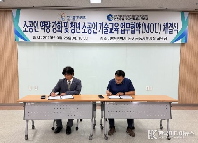 [ 한국미디어뉴스 이원영 기자 ] 인천광역시는 9월 25일 인천송림 소공인특화지원센터에서 ‘소공인 역량 강화 및 청년 소공인 기술교육 지원을 위한 업무협약(MOU)’을 체결했다고 밝혔다.