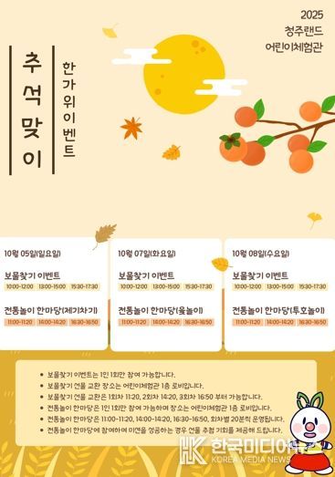 청주랜드 관계자는 “추석을 맞아 어린이들이 가족과 함께 우리 전통문화를 직접 체험하며 즐거운 명절의 추억을 쌓을 수 있도록 다양한 프로그램을 준비했다”며 “많은 시민들의 관심과 참여를 바란다”고 전했다.