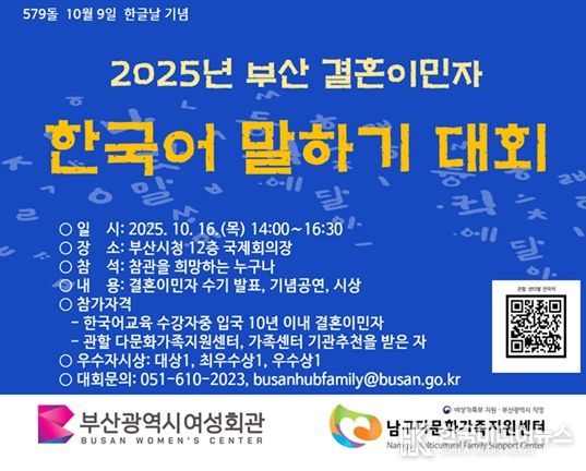 [ 한국미디어뉴스 이원영 기자 ] 부산시 여성회관은 579돌 한글날을 맞아 오는 10월 16일 오후 2시, 시청 국제회의장에서 '2025년 부산 결혼이민자 한국어 말하기 대회' 및 '다문화가족 작품전시회'를 개최한다고 밝혔다.
