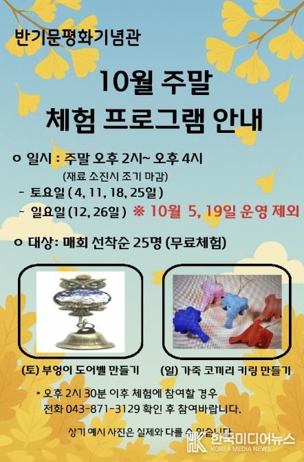 [ 한국미디어뉴스 김풍옥 기자 ] 음성군 제8대 유엔사무총장 반기문 평화기념관에서는 관람객을 위해 10월 주말 무료 체험 프로그램을 운영한다.
