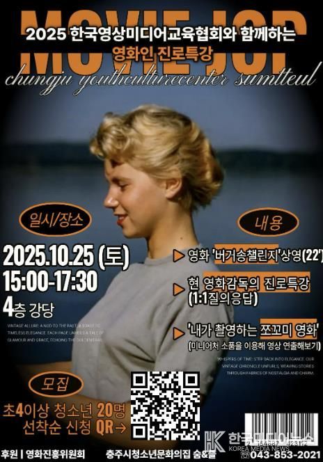 [ 한국미디어뉴스 김풍옥 기자 ] 충주시청소년문화의집 숨·뜰은 청소년들에게 영상미디어 분야와 영화감독에 대한 진로 탐색의 기회를 제공하고자 오는 10월 25일 영화인 진로 특강 프로그램을 개최한다.