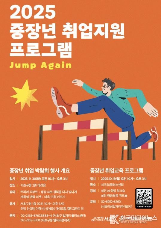 [ 한국미디어뉴스 이보영 기자 ] 서울 서초구는 중장년의 구직 활동을 응원하기 위해 오는 30일 취업지원 프로그램 ‘점프 어게인(JUMP AGAIN)’을 개최한다고 밝혔다.