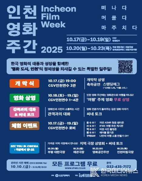 인천시가 주최하고 인천시영상위원회가 주관하는 이번 ‘인천 영화 주간 2025’는 ‘여행’을 주제로 10월 17일부터 23일까지 인천 전역에서 개최되며, 영화 도시 인천의 정체성을 새롭게 발견하고 시민 누구나 함께 즐길 수 있는 복합 영화 축제다.