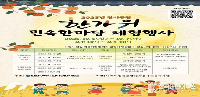 [ 한국미디어뉴스 이원영 기자 ] 인천광역시 월미공원사업소는 오는 10월 5일부터 7일까지 3일간 월미공원 내 전통정원(양진당)에서 ‘한가위 민속한마당 체험행사’를 개최한다고 밝혔다.