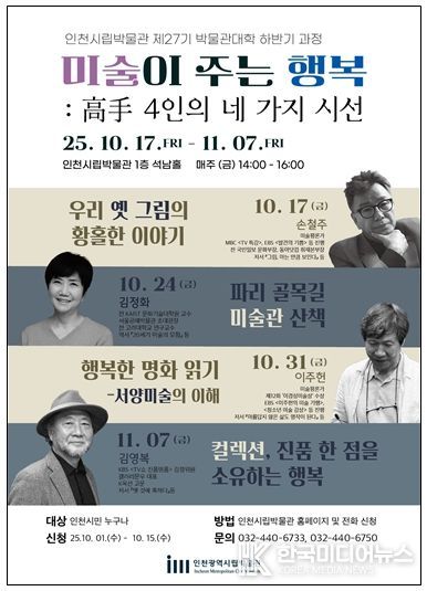 [ 한국미디어뉴스 이원영 기자 ] 인천광역시 시립박물관은 ‘미술이 주는 행복: 高手 4인의 네 가지 시선’을 주제로 오는 10월 17일부터 11월 7일까지 매주 금요일 오후 2시에‘박물관대학’을 운영한다고 밝혔다.