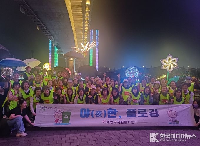 [ 한국미디어뉴스 황영수 기자 ] 인천 계양구자원봉사센터는 지난 24일 저녁, ‘계양아라온 아트웨이(빛의 거리 3단계)’와 ‘가을꽃 국화축제’가 열리는 현장에서 자원봉사자 74명과 함께 ‘야(夜)한 플로깅’ 봉사활동을 진행했다.
