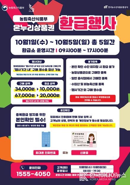 이곳 전통시장에서 구매한 농축산물 금액이 ▲6만 7천 원 이상이면 2만 원, ▲3만 4천 원 이상 6만 7천 원 미만이면 1만 원을 온누리상품권으로 돌려받을 수 있으며, 기간 내 1인당 최대 2만 원까지 환급받을 수 있다.