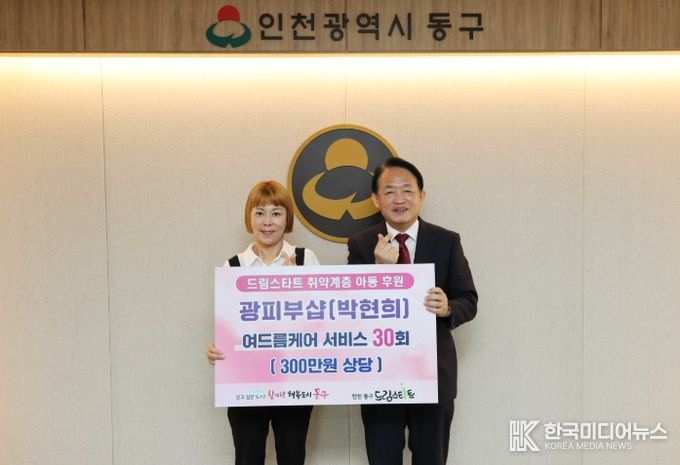 [ 한국미디어뉴스 이원희 기자 ] 인천 동구와‘광피부샵’(대표 박현희)은 지난 29일 구청 접견실에서 관내 드림스타트 아동을 위해 300만원 상당의 여드름 케어 서비스를 후원하는 기탁식 열었다고 밝혔다.