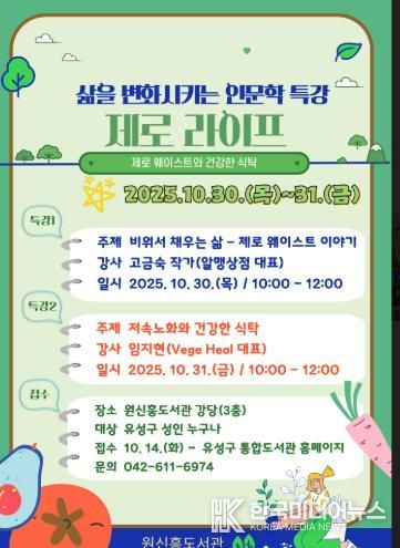 [ 한국미디어뉴스 이보영 기자 ] 대전 유성구는 10월 30일과 31일 이틀간 원신흥도서관에서 ‘삶을 변화시키는 인문학 특강: 제로 라이프’를 운영한다.