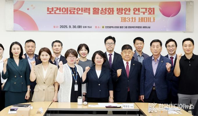 [ 한국미디어뉴스 이원영 기자 ] 인천광역시의회 의원연구단체인 ‘보건의료인력 활성화 방안 연구회’는 30일 문화복지위원회 세미나실에서 박판순 대표의원(국·비례)을 비롯해 박창호(국·비례)·이봉락(국·미추홀구3) 의원, ‘의료기사단체 정책연구단’관계자 등이 참석한 가운데 ‘제3차 정책 세미나’를 개최했다.