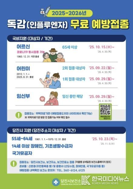한편, 보건소는 오는 23일부터 자체 사업으로 55세~64세(1961.1.1.~1970.12.31. 출생) 당진시민, 국가유공자, 14세 이상 기초생활수급자 및 장애인을 대상으로 무료 예방접종을 당진시보건소, 보건지소, 보건진료소에서 실시한다.