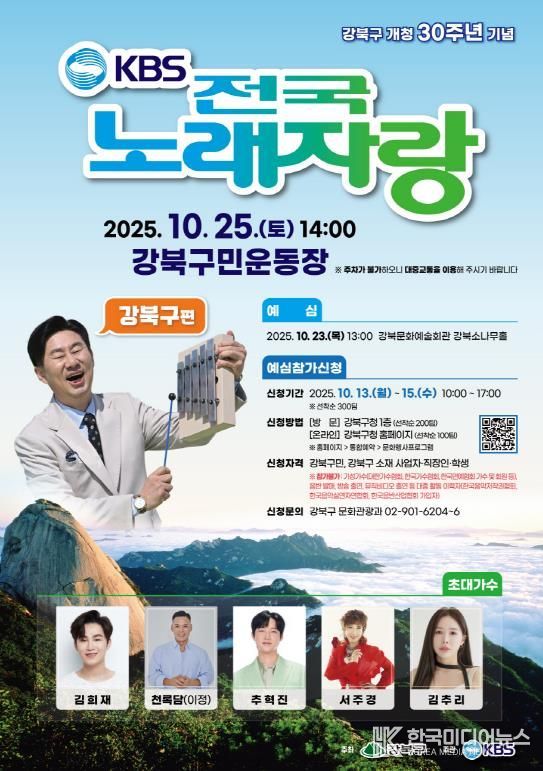 [ 한국미디어뉴스 이보영 기자 ] 강북구는 개청 30주년을 기념해 오는 10월 25일 오후 2시 강북구민운동장에서 KBS 장수 예능 프로그램 ‘전국노래자랑’ 강북구편을 개최한다고 밝혔다.