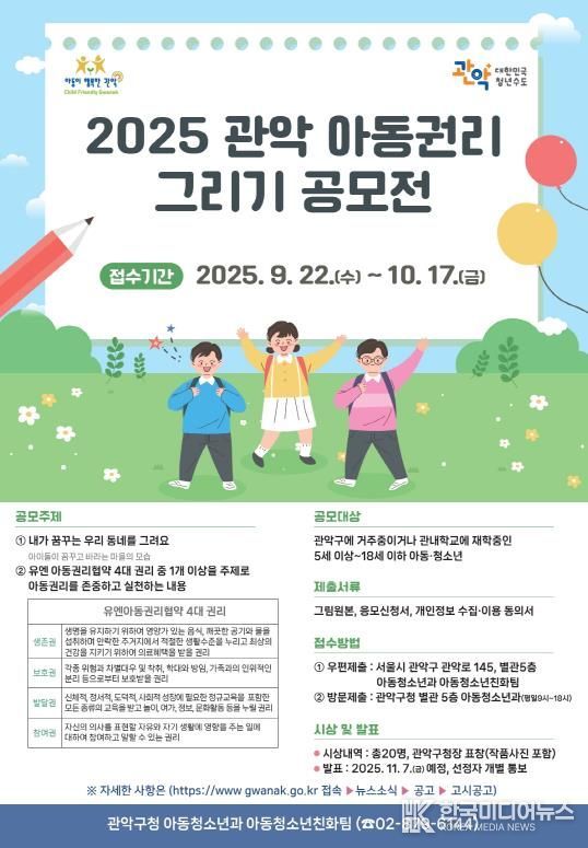 응모 기간은 오는 10월 17일까지이며, 참가 대상은 관악구 내 어린이집, 유치원, 초중고교에 재학 중이거나 관내에 거주 중인 5세~18세 이하의 아동과 청소년이다.