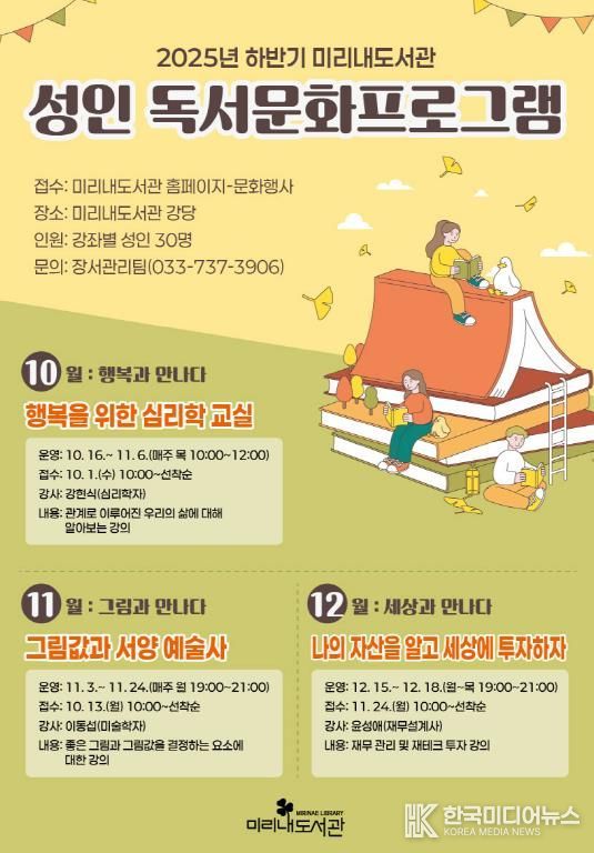 [ 한국미디어뉴스 이원영 기자 ] 원주시 미리내도서관은 지역 시민들의 문화적 접근성을 높이기 위해 성인을 대상으로 하반기 독서문화프로그램을 운영한다.